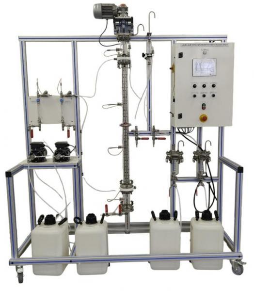 A gear pump feeds the mixture from the top of the column. A second gear pump feeds the solvent from the bottom of the column. The mixture and the solvent will therefore circulate against the current, which will allow the solvent to extract the solute by shearing the discs on the liquid.
